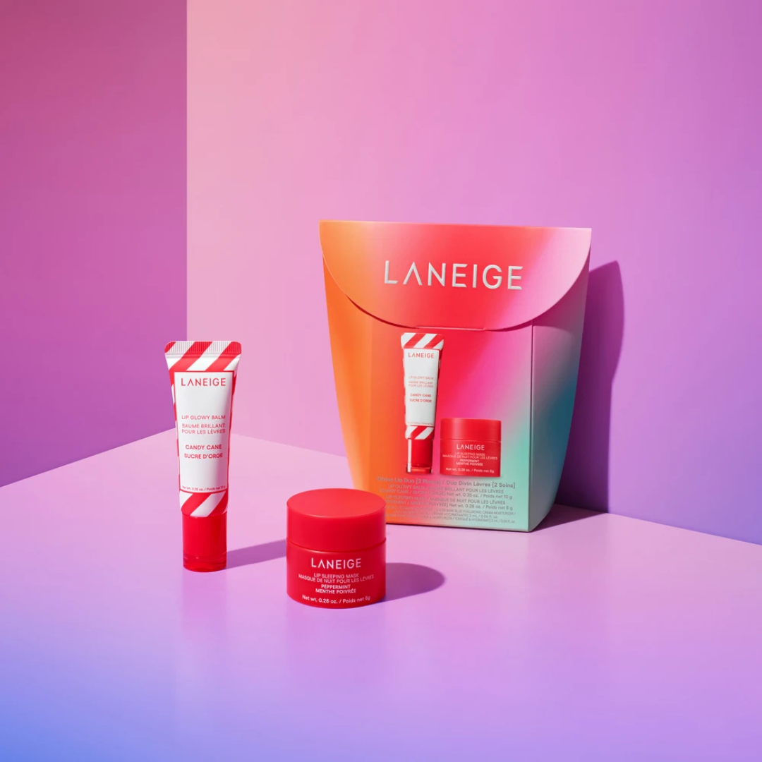 Quench dry lips with LANEIGE’s Divine Lip Duo Set, containing the Lip Glowy Balm in ‘Candy Cane’ and the Lip Sleeping Mask in ‘Peppermint’.